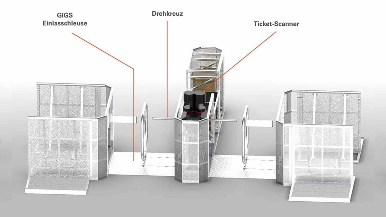 The two entry gate concepts are designed to be used in combination and can be adjusted to any specific situation on-site. Crowd simulations by accu:rate give proof of the improved entry situation.